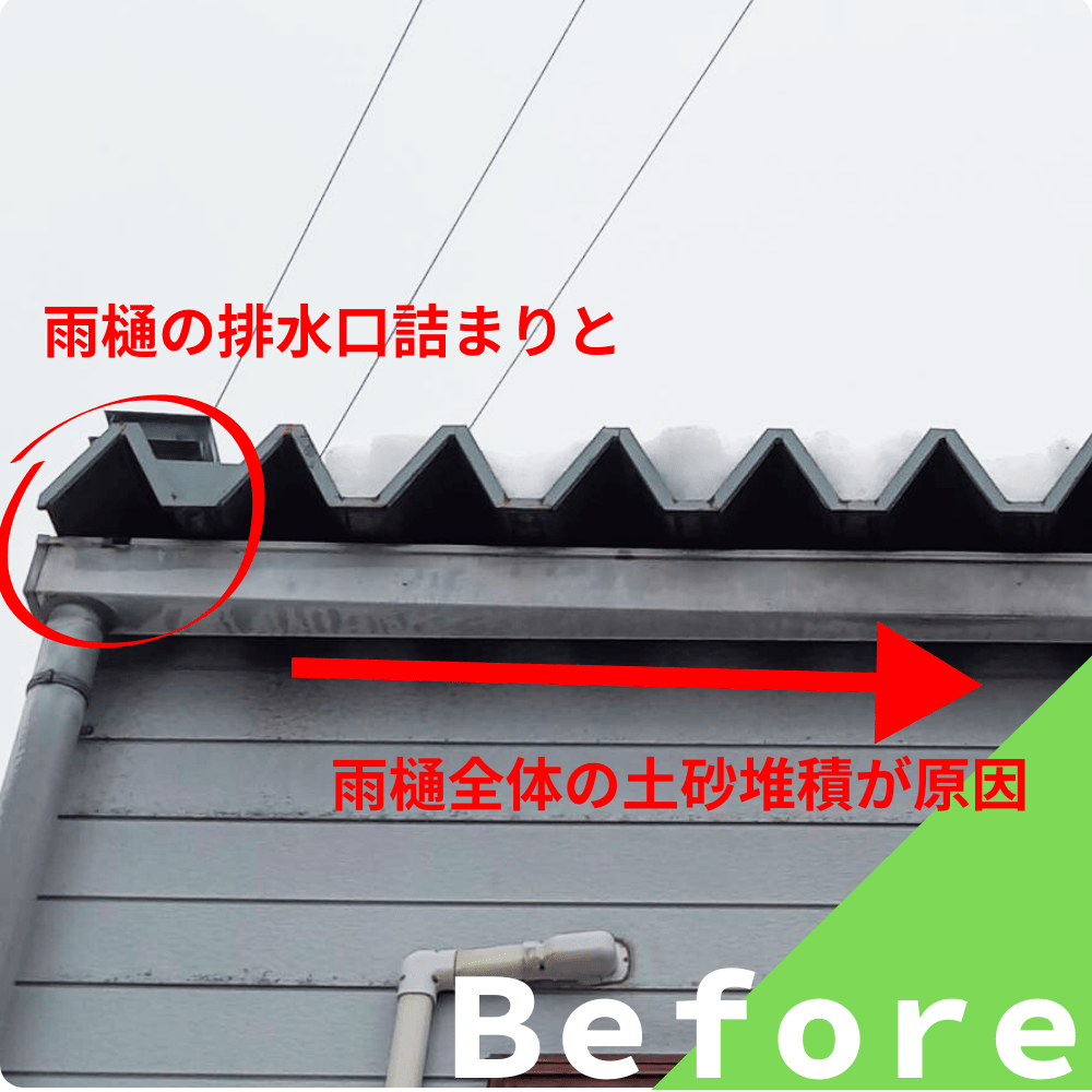 原因は、土砂やごみが雨樋内に堆積し両側の排水口をふさいでいたことでした。