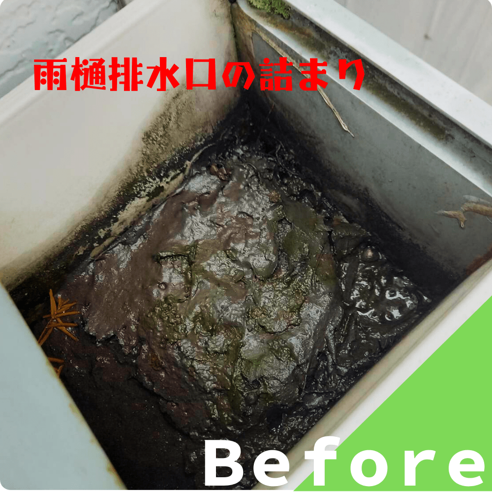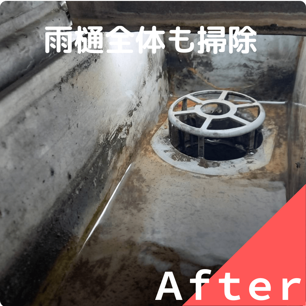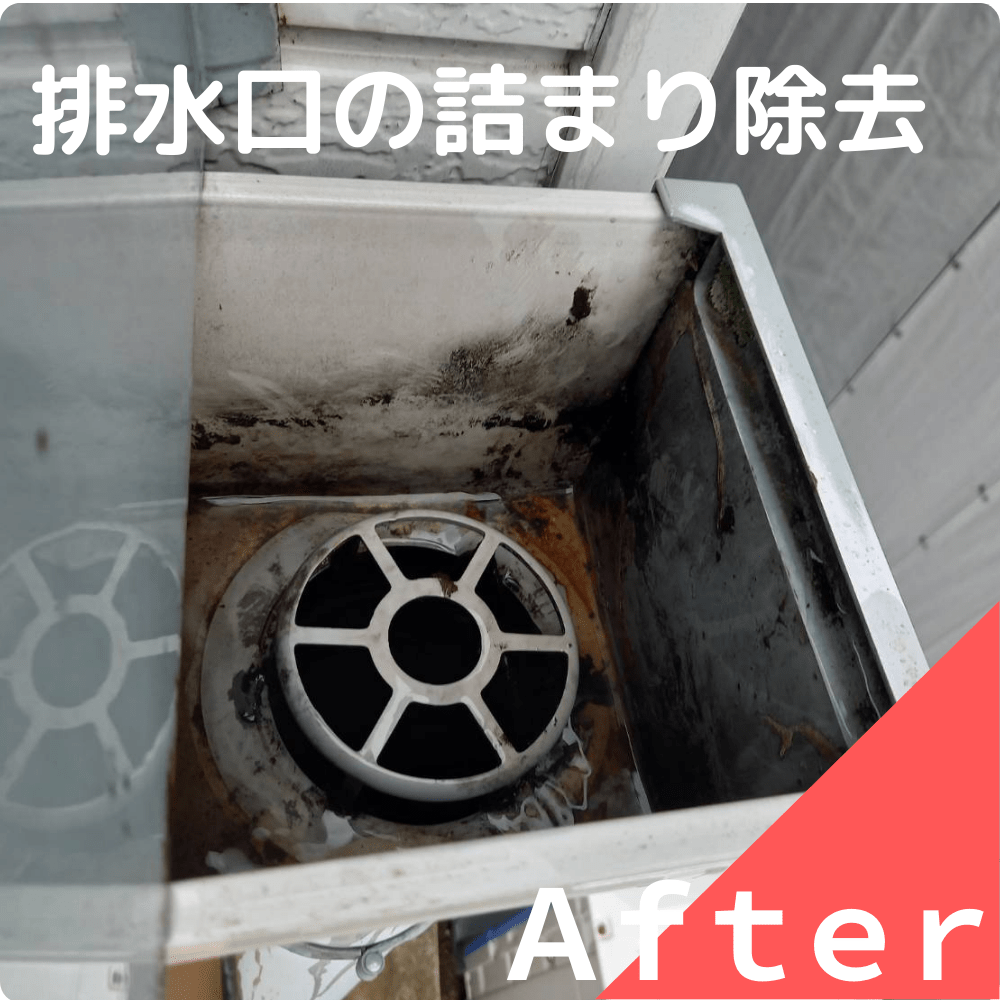 雨樋内の土砂やゴミを取り除き、排水口の掃除をしたところ、溢水及び詰まりは解消されました!