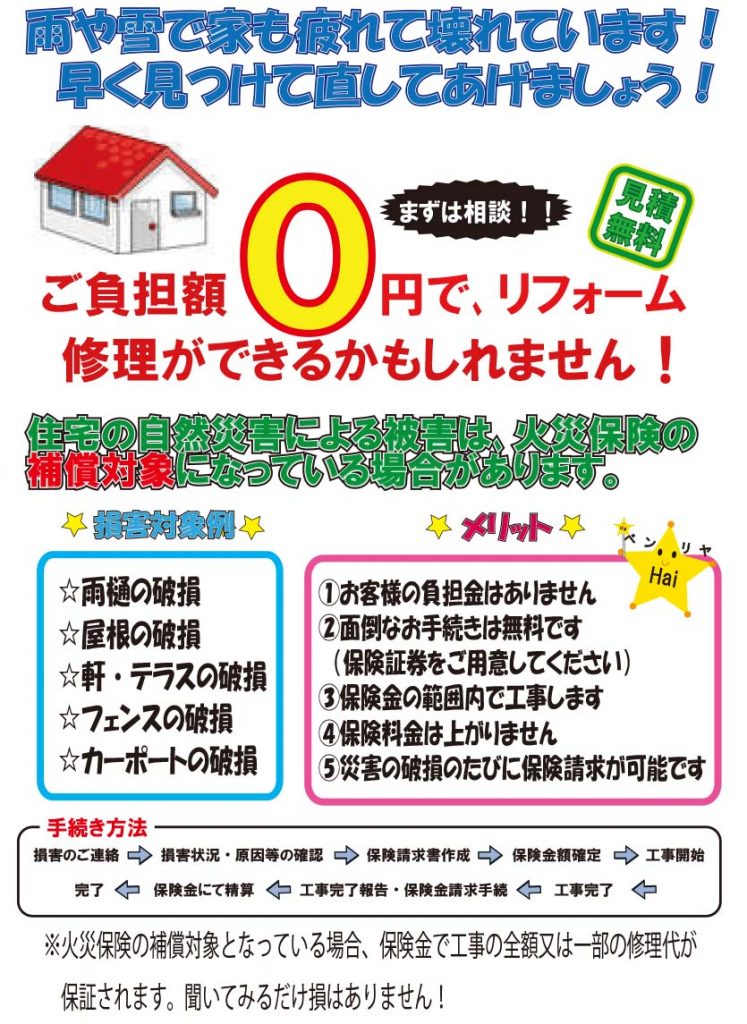 ちなみに火災保険に加入している方、住宅の自然災害による被害は火災保険の補償対象になっている場合が多いです!実質無料で修理ができるかもしれません。