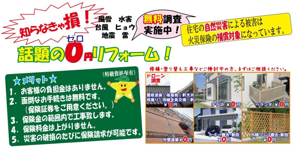 0円で雨トヨ修理が出来ます 2022年4月13日 最終更新日時 : 2022年7月22日 nagaokaminamihaihainet 自然災害による雨トヨ、外壁、屋根、ベランダ、カーポートなどの壊れは火災保険の補償対象です。保険金の範囲で工事出来ます。
