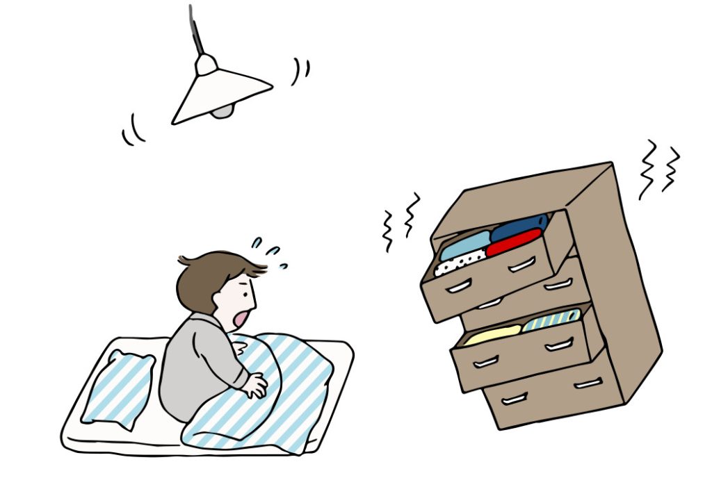 眠っているときに災害が起きると、暗く無防備な状態なのでとっさに動くことができません。同じく、こどもはとっさの行動がわからないことも多いでしょう。